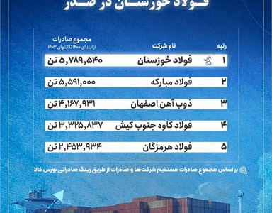 در بررسی عملکرد صادراتی شرکتهای فولادی کشور از ابتدای سال ۱۴۰۰ تا پایان ۱۴۰۳، فولاد خوزستان با اقتدار در صدر فهرست بزرگترین صادرکنندگان فولاد ایران قرار گرفت.